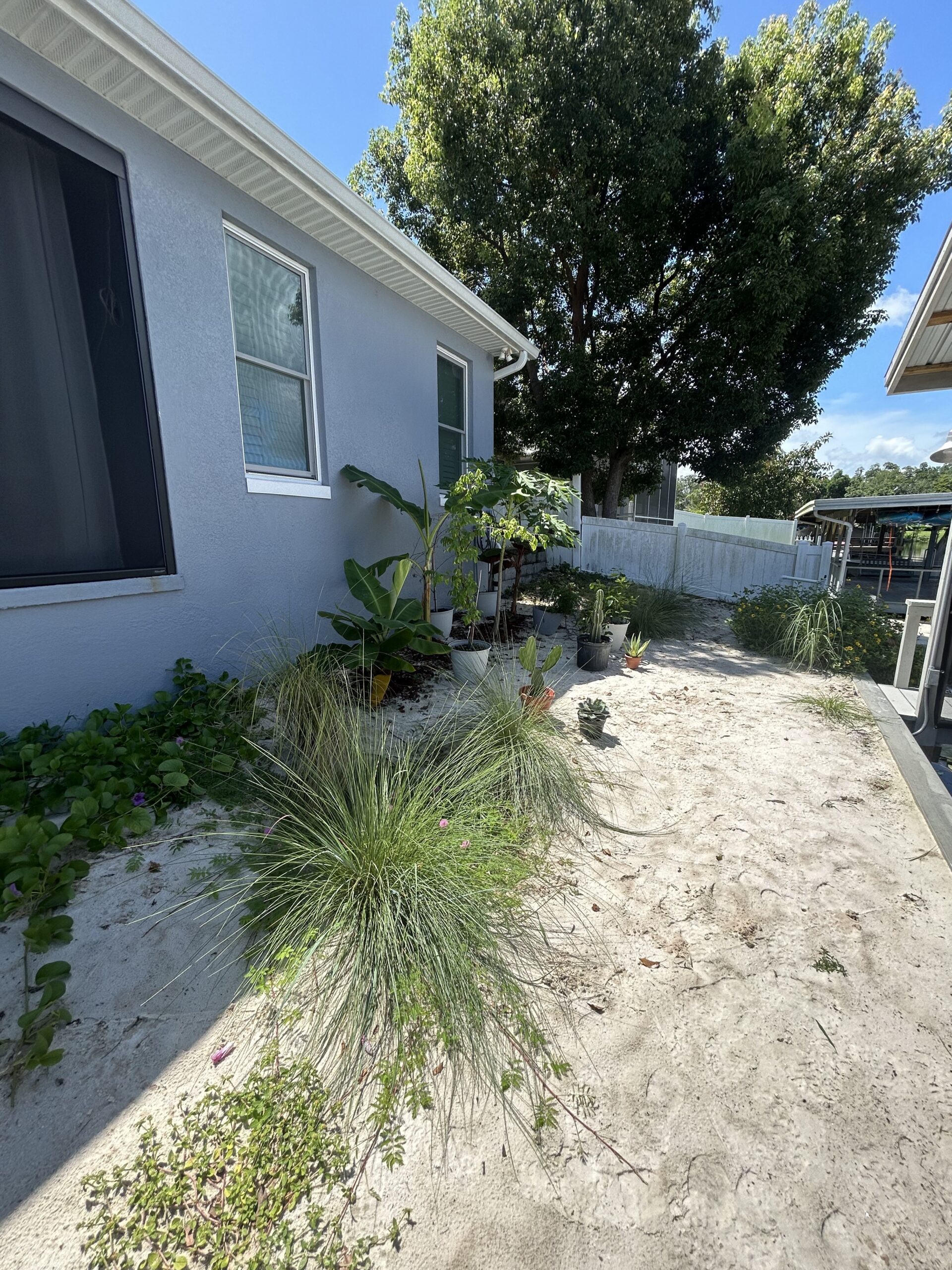Soon, muhly grass will bloom, creating a colorful display. Bananas, papaya, and star fruit are growing well, hinting at fruit. The canal will reflect this vibrant garden. Follow us for coastal garden maintenance tips or contact us for advice this Canal-Side Beach Garden Summer Garden Cleanup season. Stay tuned for the fall bloom! 🌴🌊